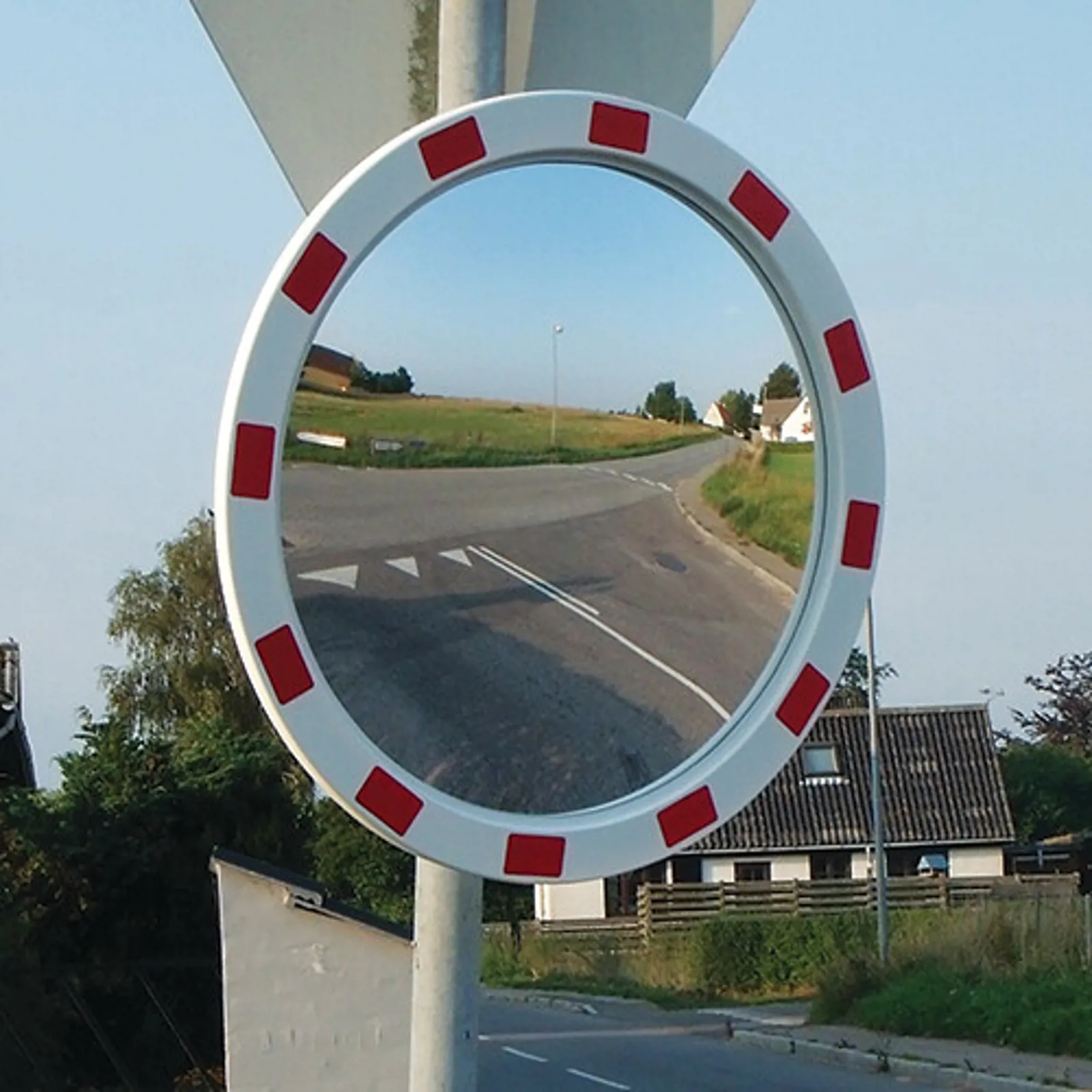 Trafikspejle kan hjælpe ved udkørsler og skarpe sving hvor oversigtsforholdene er utilstrækkelige. Til udendørs brug. Er fremstillet i plast, omkranset med rød refleks på hvid baggrund for bedre synlighed. Spejlet leveres med et 2” rørbeslag. Som supplement kan vælges vægbeslag til et eller to spejle.