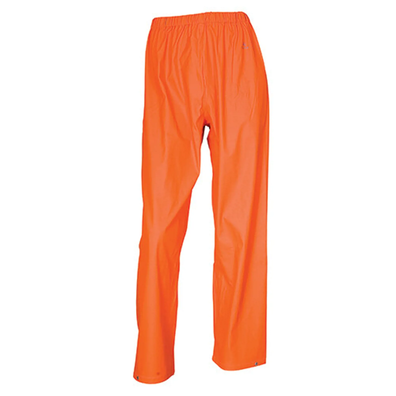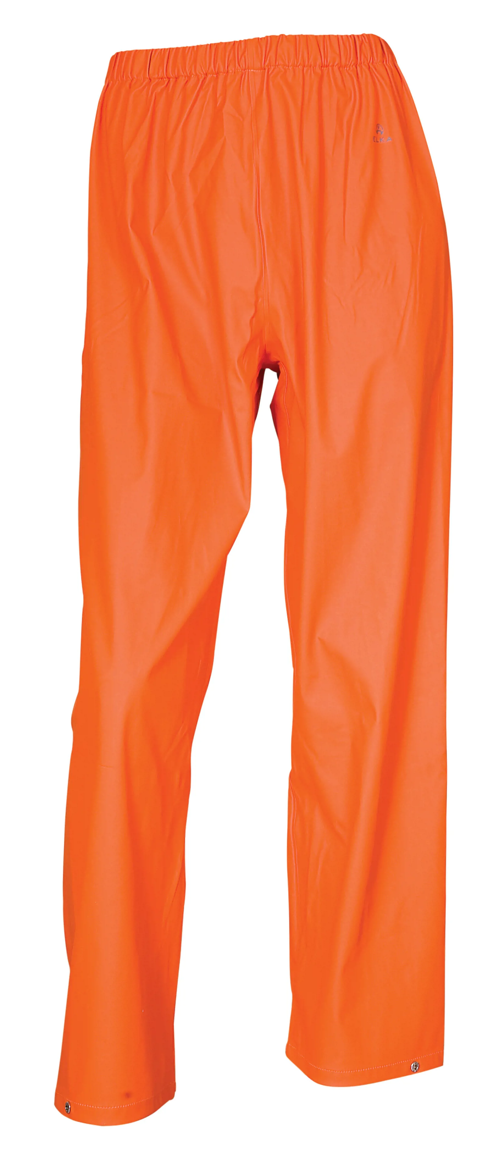 Regnbuks med elastiktalje og trykknap i ben. Højfrekvenssvejset. Materiale: 100% polyester/PU, 190 g/m2.