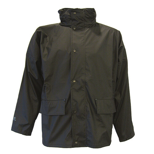 Regnjakke med gennemgående lynlås, stormflap og trykknapper. Hætte kan foldes ind i krave. Justerbart vindfang med burreluk i ærmer. To rummelige lommer foran. Snor og snorestopper i talje. Højfrekvenssvejset. Materiale: 100% polyester/PU, 190 g/m2.