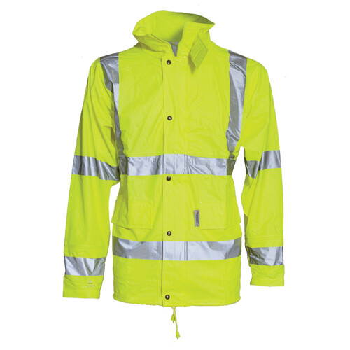 Regnjakke i hi-viz gul med refleksstriber og lynlås. 2 lommer med klap og snøretræk i nedre kant. Materiale: 190 g. PU/polyester. Vandsøjle: H₂O: > 5.000 mm.