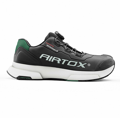 Airtox FL44 sikkerhedssko med StyroSoft® såler og Whitelayer® sømværn. Åndbart og fugtabsorberende materiale. Materiale: Vegansk vandafvisende læder. Kølesystem i indlægssåler. Let plast tåkappe. Olie og syrebestandig ydersål. Varmebestandig ydersål op til 300 °C. Bred pasform. Farve: Raven black.