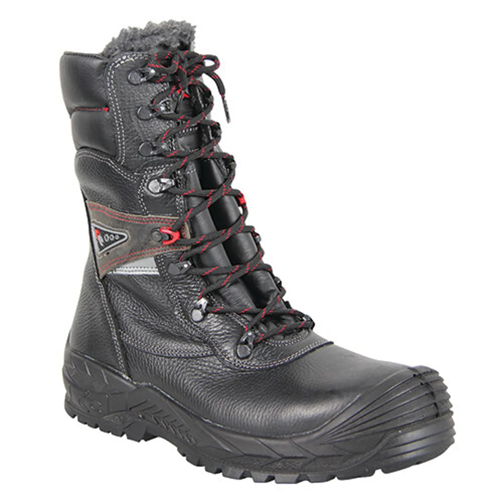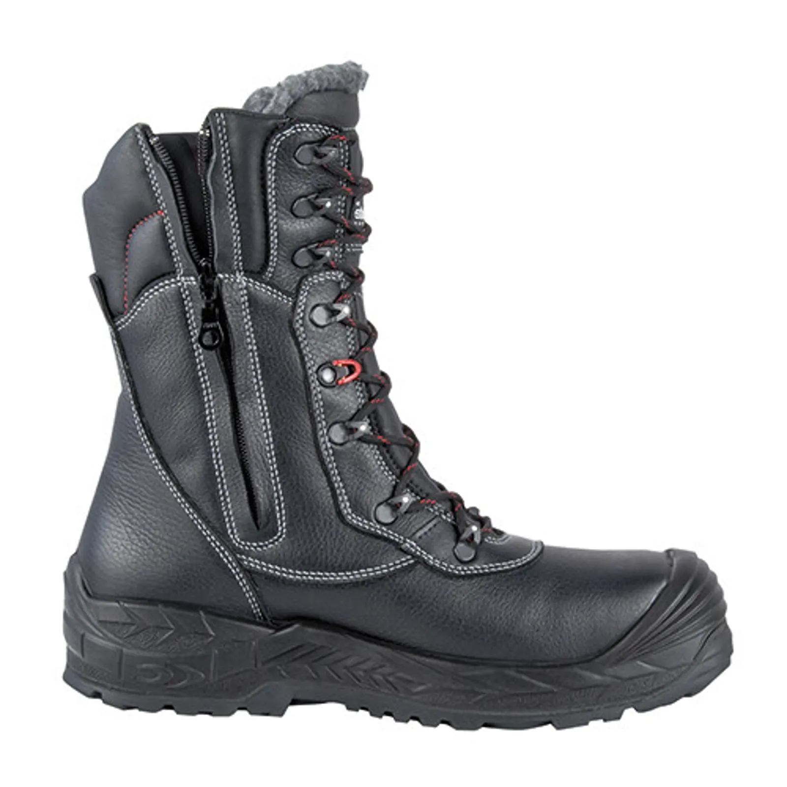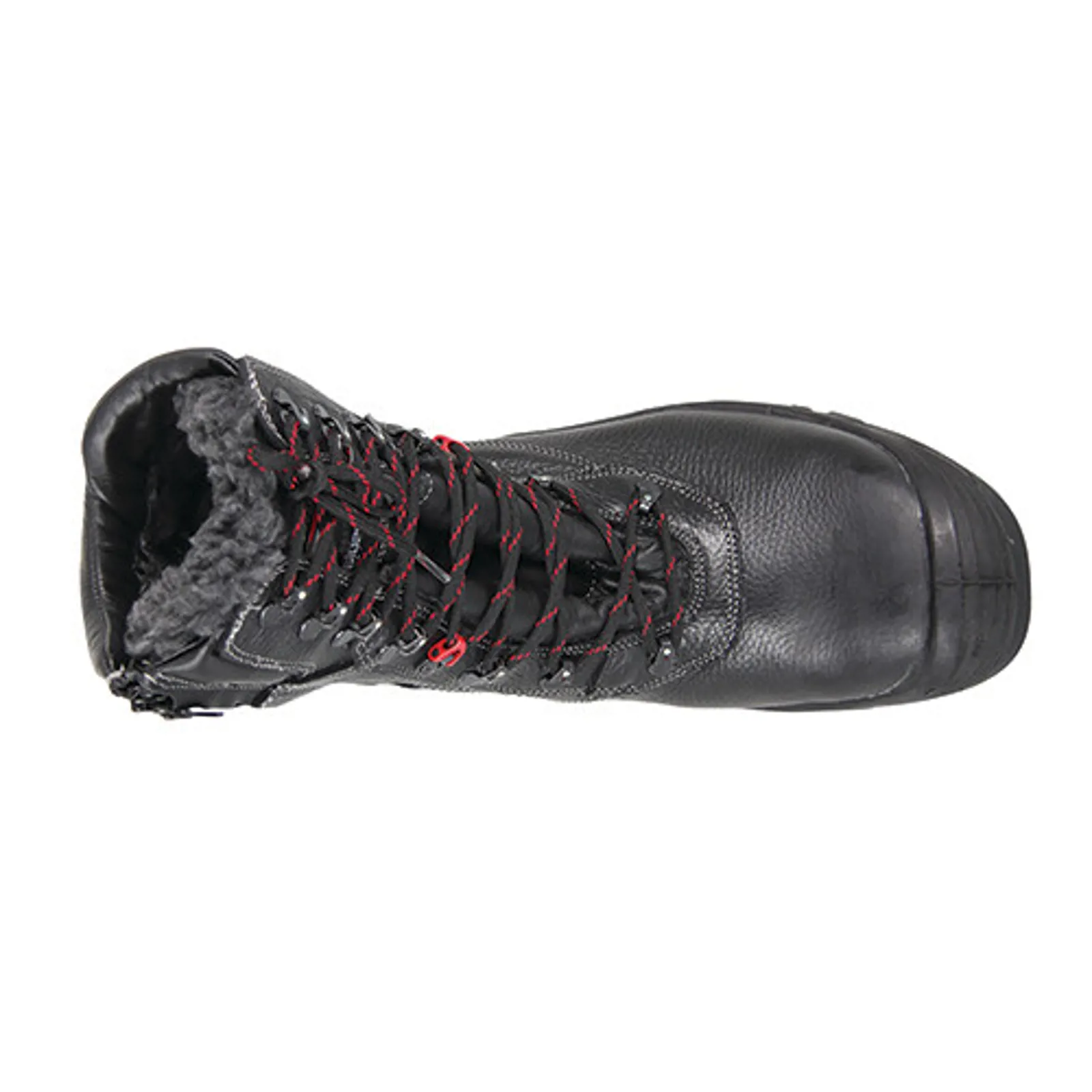 Støvle med overdel af vandafvisende læder, lynlås i siden, snøreluk og snudebeskyttelse. Tåler kortvarig kontakt med høj varme. Kraftigt økologisk fleece vinterfor, der er åndbart og slidstærkt, kombineret med Thinsulate B2000 membran. Tåværn af komposit og sømværn af tekstil. Fodsål af blød kuldeisolerende PU med stødabsorbtion. Anatomisk, antistatisk, blød og komfortabel. Ydersål af Cold Defender PU og nitril. Bredde: 12.