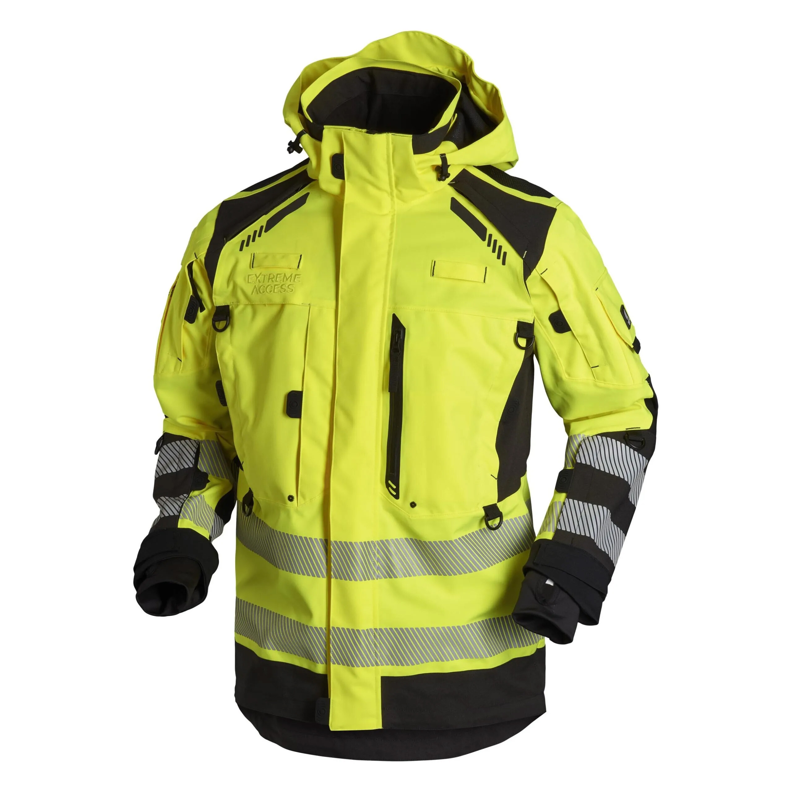 Denne Ultimate jakke har vandtæthed på 20.000 mm. vandsøjle og åndbarhed på 15.000g/m2/24hr. Ydermaterialet er lavet af 220g/m2 polyester, med 2-lags med membran og 4-vejs stretch. Alle lommer er udstyret med D-ringe (max vægt 5 kg), jakken har en aftagelig justerbar hætte, samt forstærkning på skulder, albuer og ved håndled. Den har to ventilationsåbninger øverst på bryst og to ventilationsåbninger på ryggen. Jakken kan forbindes til bukser med lynlås i taljen.