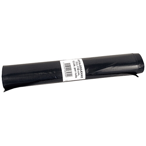 Ekstra kraftige sorte affaldssække. Hver rulle indeholder 10 sække. Ikke godkendt til at opbevare fødevarer. Indeholder genanvendt LDPE. 50 my. Vægt per styk 80 g. Mål: 70 x 110 cm.