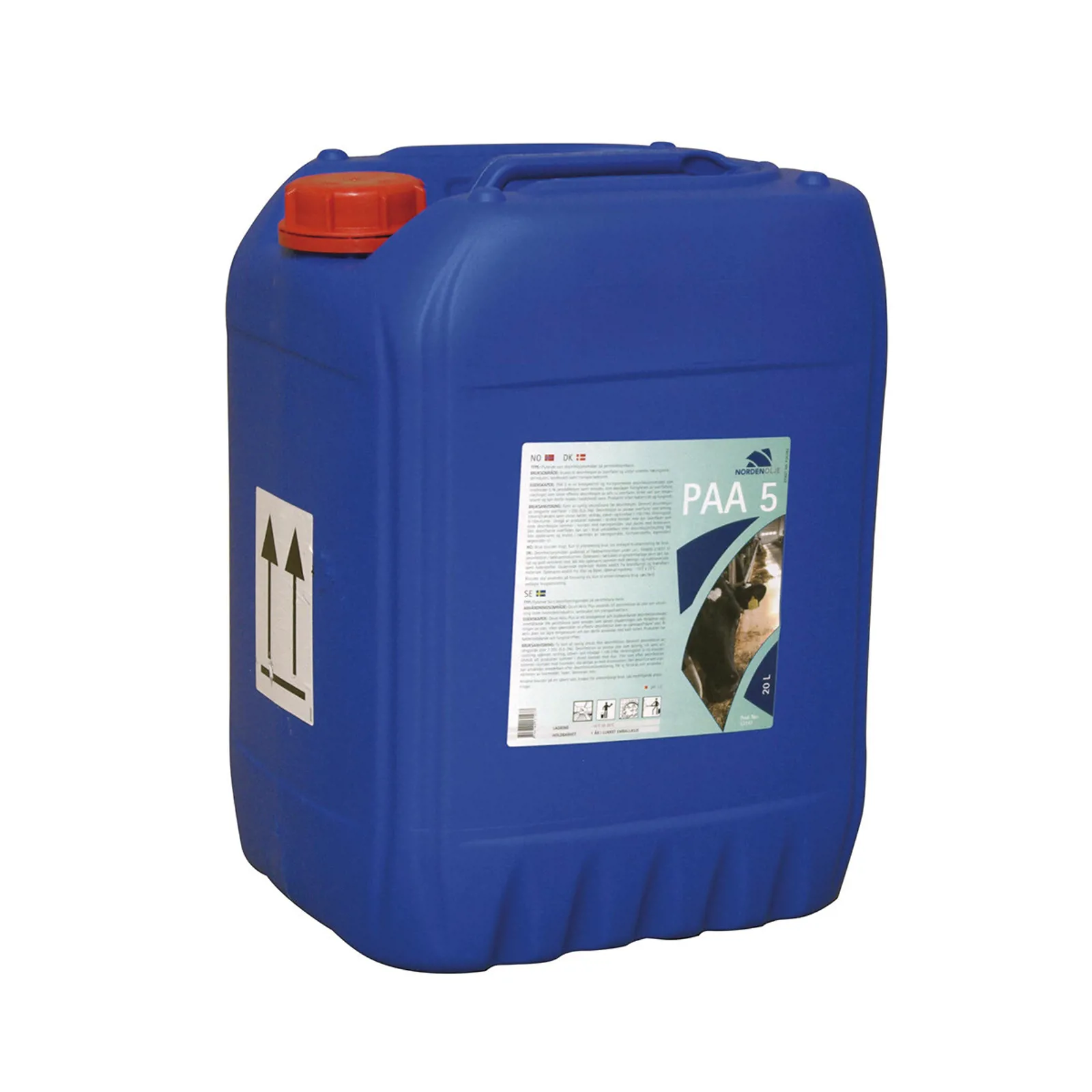 Flydende surt desinfektionsmiddel på pereddikksyrebasis. Bruges til desinfektion af overflader og udstyr indenfor fødevareindustrien, landbruget samt transportsektoren. PAA 5 er et bredspektret og hurtigvirkende desinfektionsmiddel som indeholder 5% pereddikesyre samt tensider, som øger fugtigheden af overfladene, noget som sikrer effektiv desinfektion af selv ru overflader. Virker ved lave temperaturer og kan derfor bruges i koldt vand. Produktet virker baktericid og fungicid. Fjern alt synlig snavs før desinfektion. Generel desinfektion af rengjorte overflader 1:200 (0,5-3%). Desinfektion af porøse overflader som beton, træværk samt udstyr, bøtter, værktøj, støvle- og klovbad 1:100 (1%). Virkningstid: 5-15 minutter. Undgå at produktet kommer i direkte kontakt med dyr. Overflader som efter desinfektion kommer i kontakt med næringsmidler, skal skylles med drikkevand.