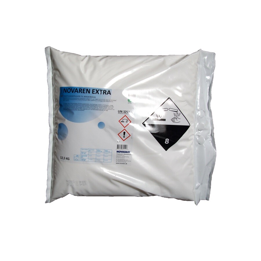 Novaren Extra er et vaskepulver til tekstil. Det koncentrerede vaskepulver er velegnet til vask i blødt vand af hvide såvel som farveægte kulørte tekstiler af bomuld eller polyester/bomuld i både vaskerør og centrifugerende vaskemaskiner. Vaskemidlet opbevares i tætlukket originalemballage og skal beskyttes mod syrer og vand. Holdbarhed: 36 måneder. Indhold: 12,5 kg.