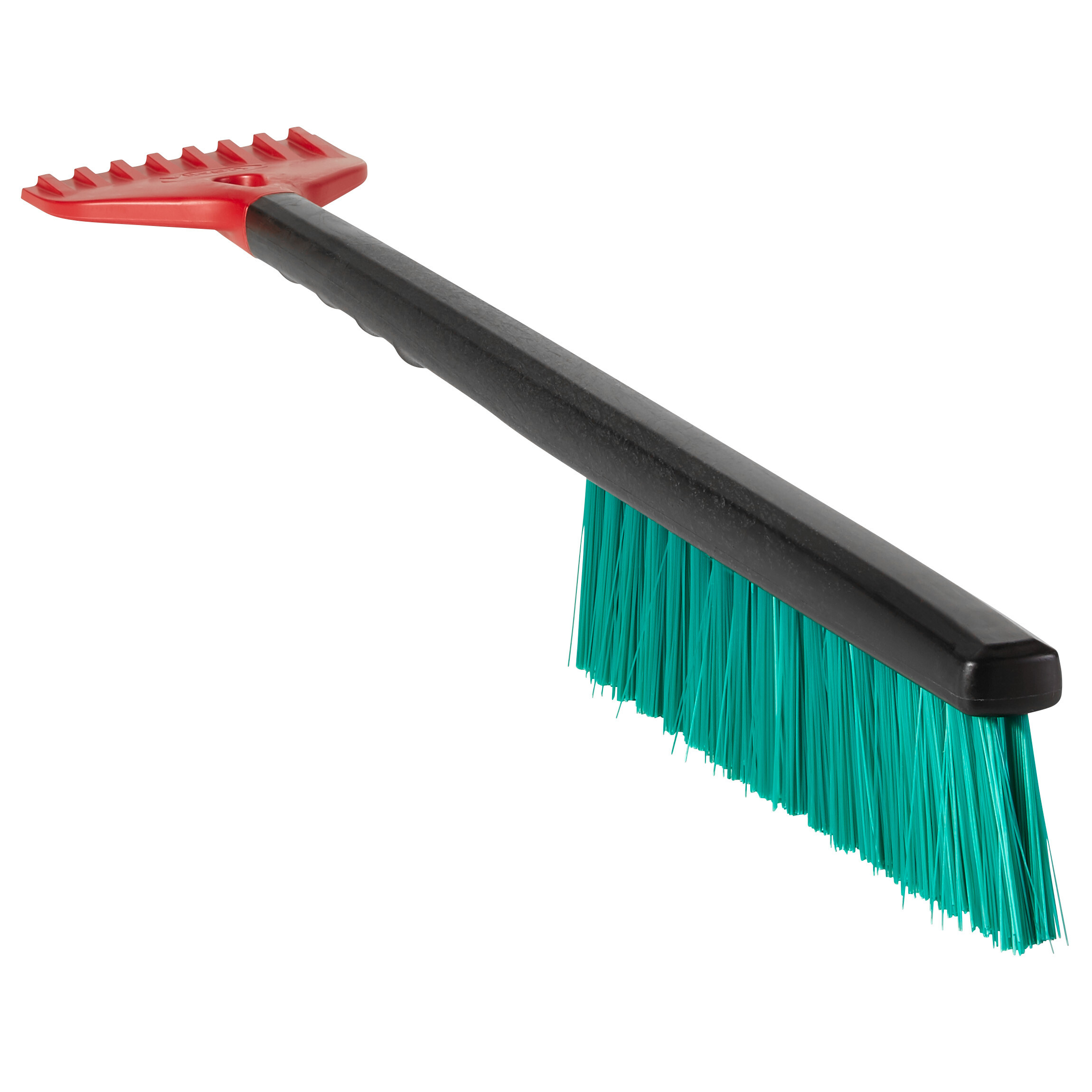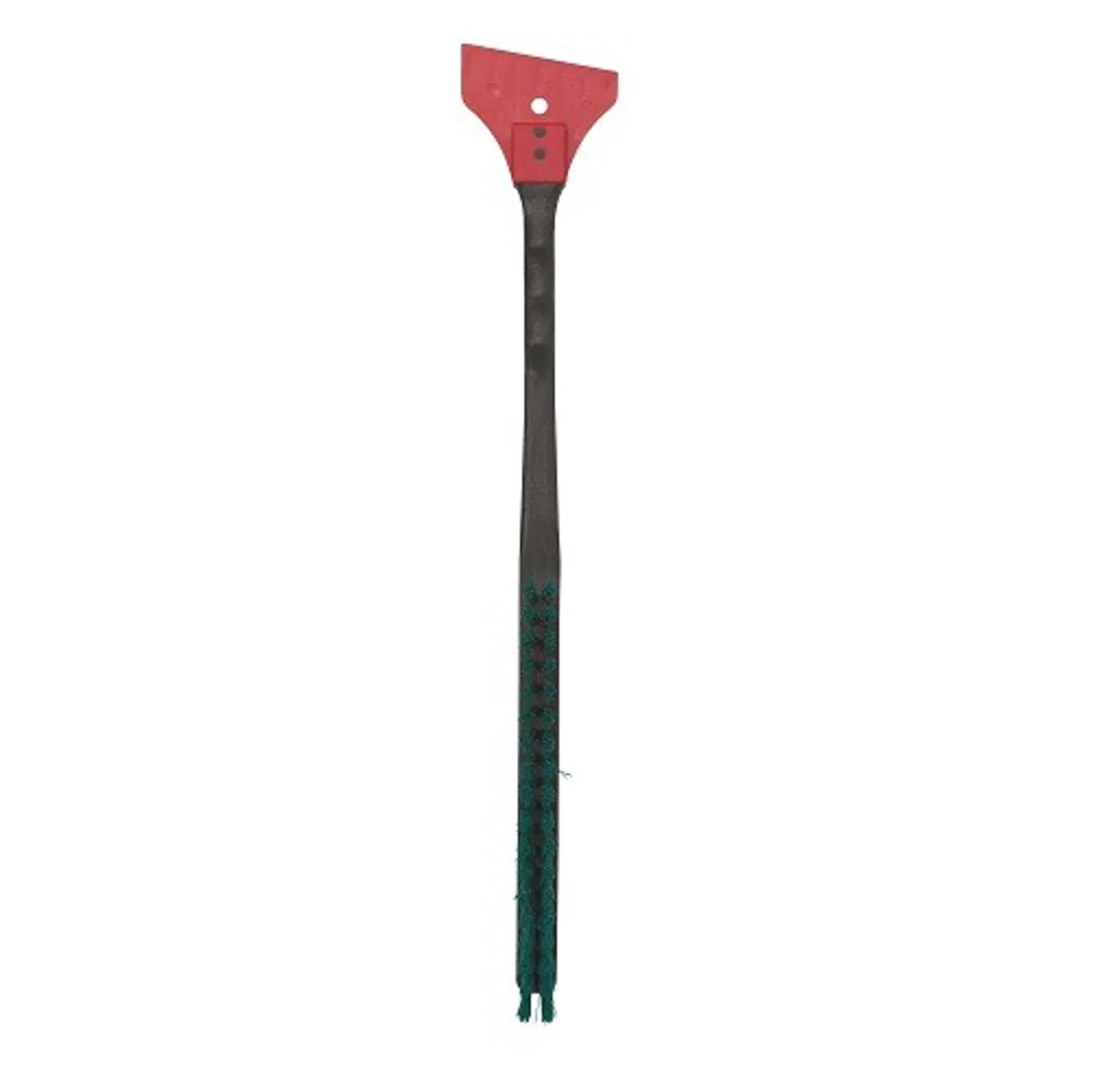 Sort snebørste med isskraber udført i sort polypropylen med grønne PVC filamenter. Mål: L 490 x B 80 x H 60 mm.