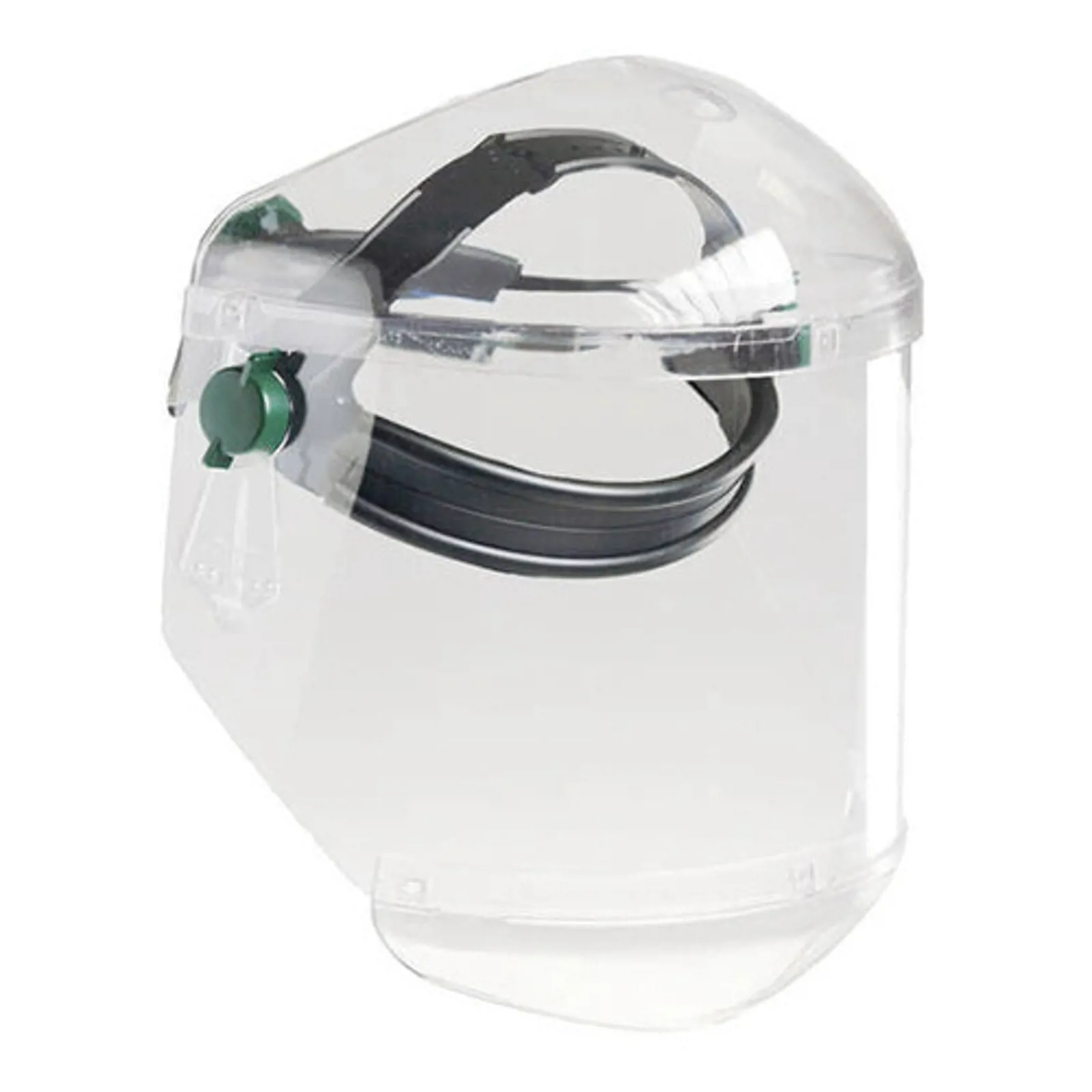 Kraftig skærm af høj kvalitet i PC. Stor dækning af ansigt, hals og ører. Klar pandebeskytter for bedre udsyn. Komfortabelt hovedbånd med håndhjul. Visiret kan vippes op og låses fast.