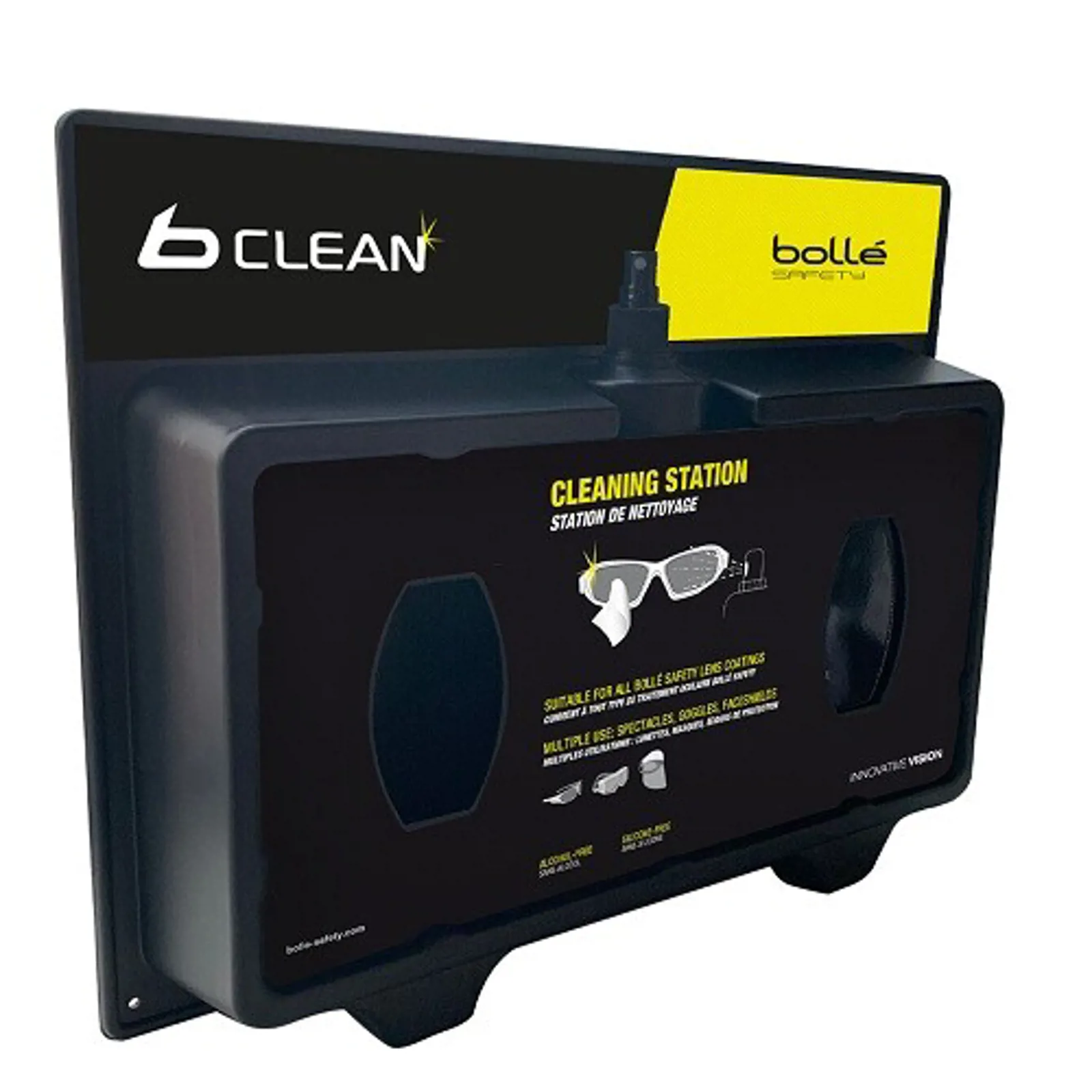 Bollé rensestation er én af flere rengørings- og antidug løsninger fra Bollé Safety. B-Clean er en komplet og effektiv serie af silikonefrie rengøringsløsninger. Aqua-formlen garanterer perfekt rengøring og beskyttelse til dine briller og beskyttelsesbriller.