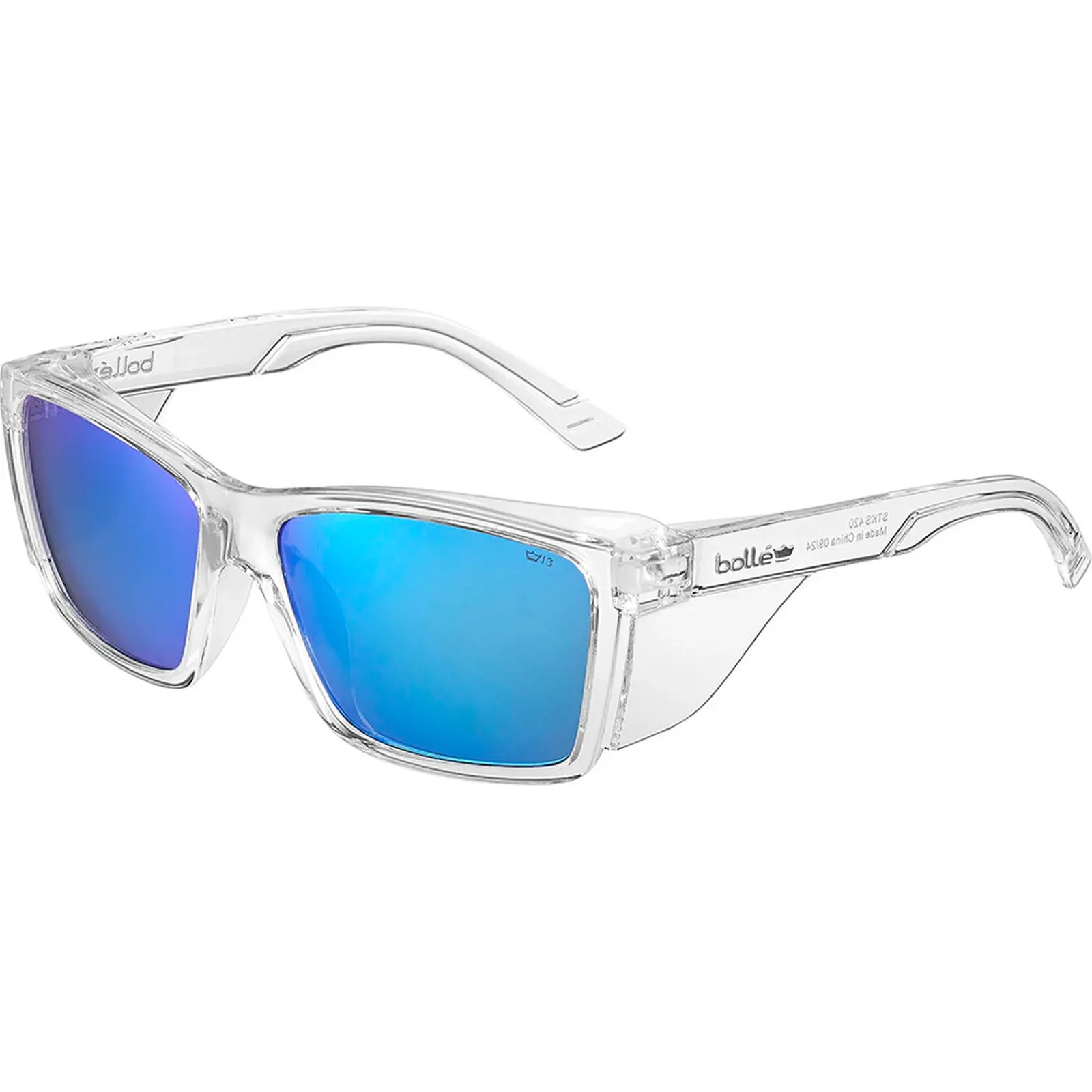 Bollé Safety STKS er en industrisikkerhedsbrille med fuld ramme i genanvendt polycarbonat og 2,2 mm polycarbonatlinser. Integrerede sideskjolde og øvre brynbeskyttelse giver udvidet dækning.