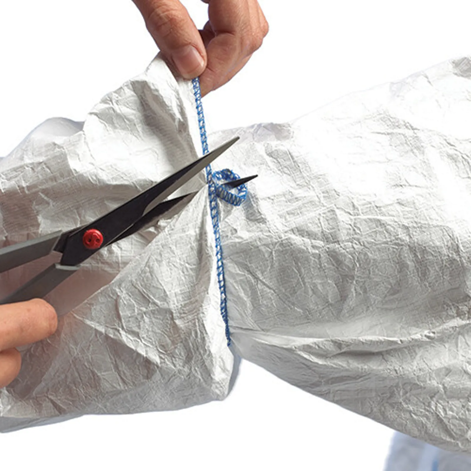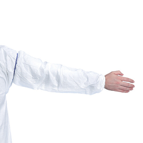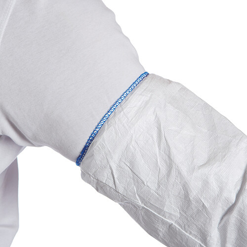 Har elastik i begge ender. Materiale: Tyvek® 1431N (polyethylenfibre). Slidstærkt, fnugfrit og antistatisk. Beskytter mod støv, væskestænk og visse kemikalier. Størrelse: 50 cm. Hvid.