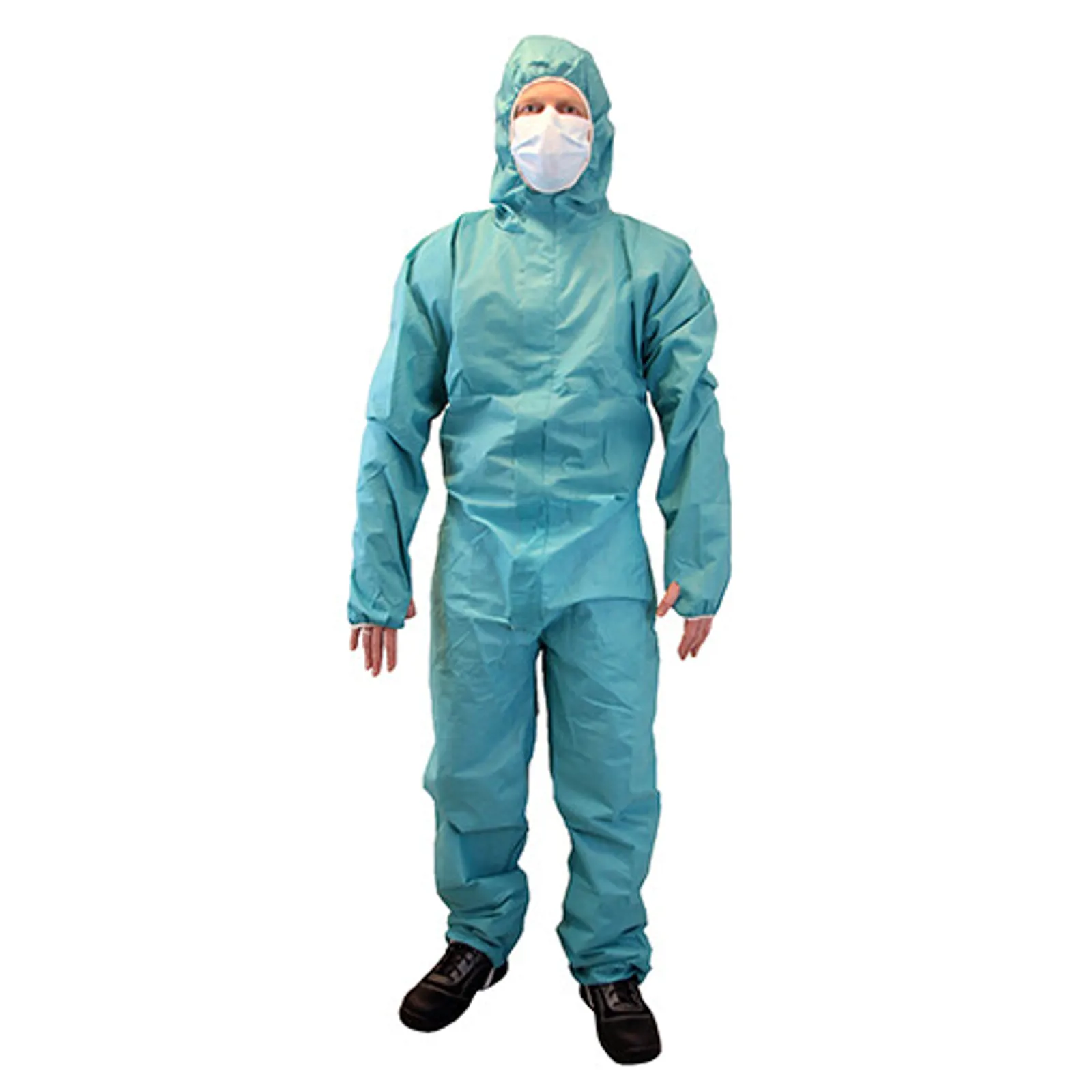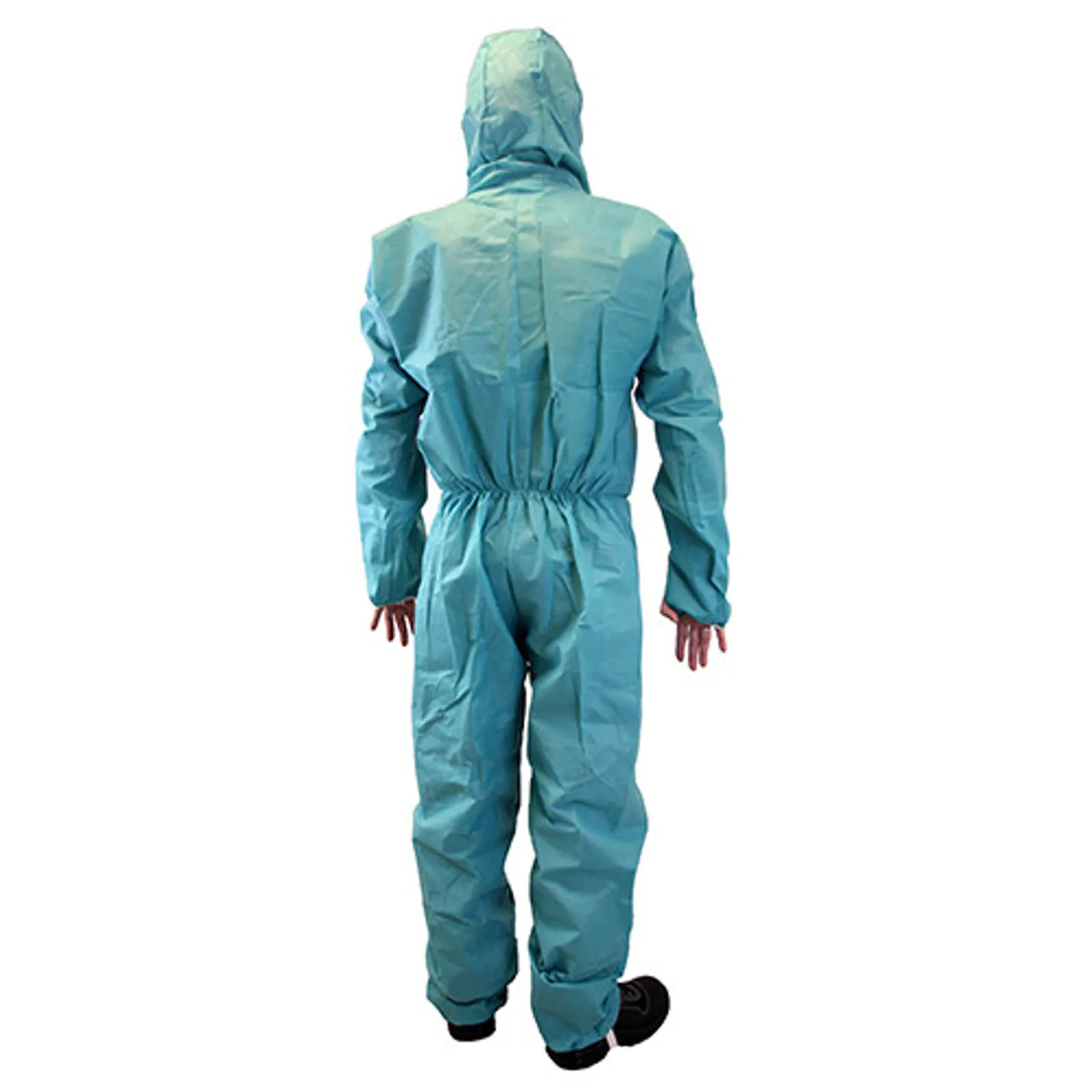 Grøn beskyttelsesdragt med elastik i hætten, beskyttet lynlås, strikket manchet og elastik i ankelen. Antistatisk. SMS materiale sikrer god komfort.