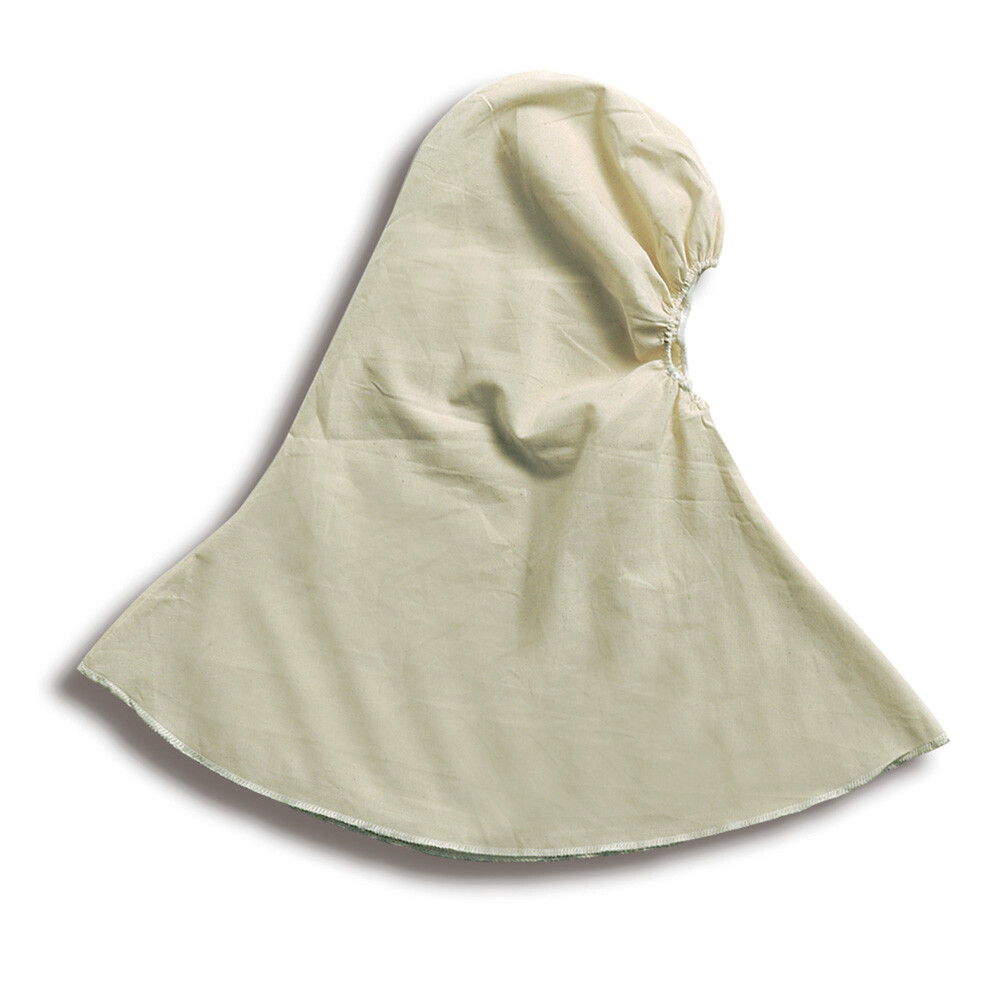 Åndbar hætte med skulderdækning af ubleget bomuld. Elastik ved ansigtsåbning. Beskytter mod snavs.