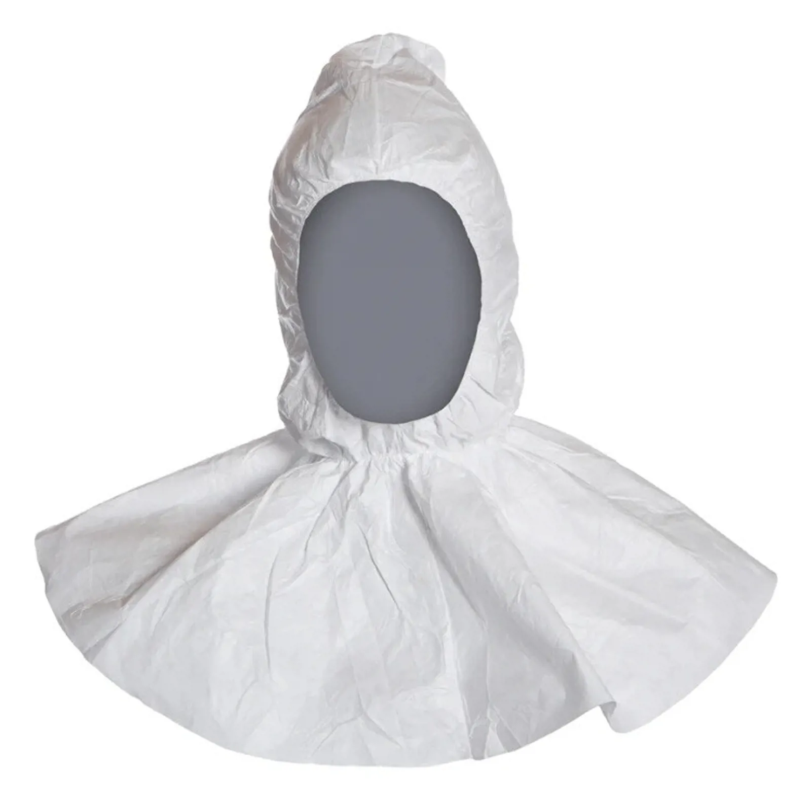 Hætte med skulderslag og udskæring til ansigtet med elastik i kanten. Fremstillet af Tyvek® 1431N (polyethylenfibre), der er slidstærkt, fnugfrit og antistatisk. Beskytter mod støv, væskestænk og visse kemikalier.