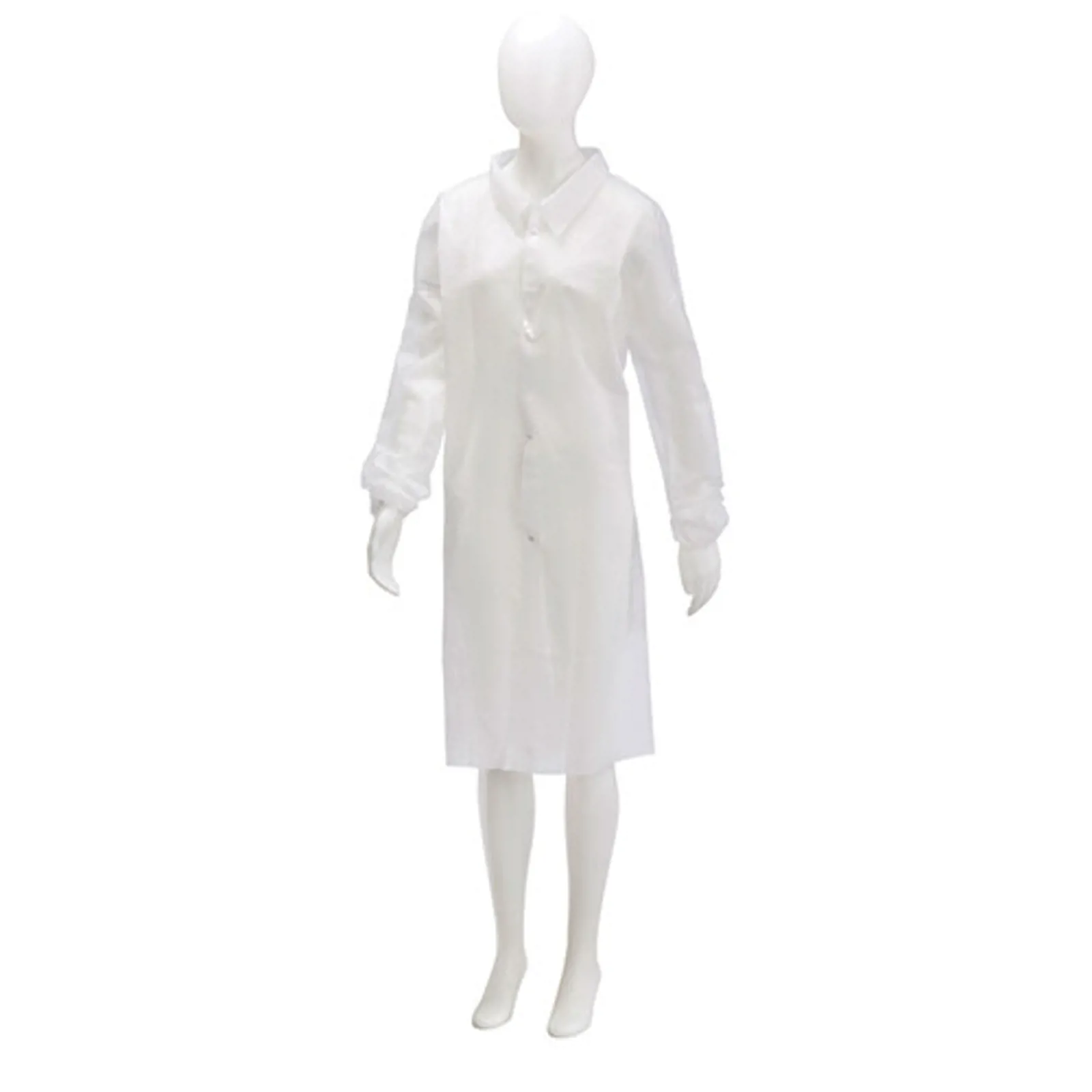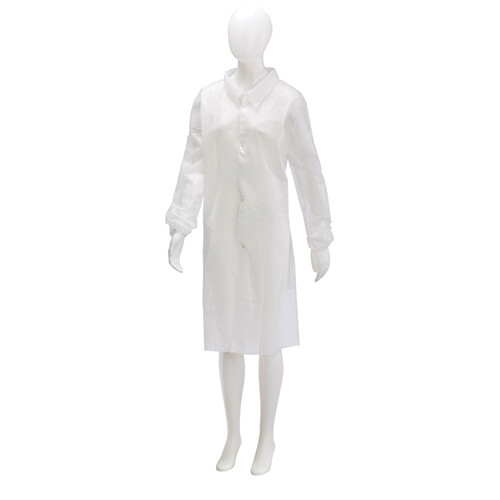 Hvid besøgsjakke til engangsbrug. Trykknapper foran. Materiale: Non-wowen polypropylen. Fås i flere størrelser. Beskytter bruger og arbejdsmiljø.