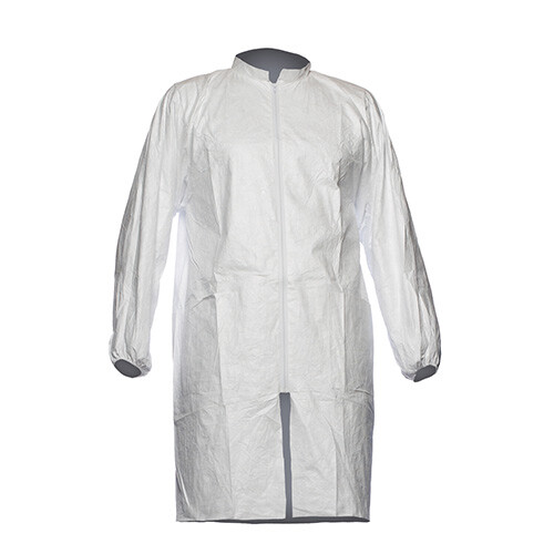 Hvid kittel med krave, lynlås og lommer foran. Materiale: Tyvek® 1431N (polyethylenfibre). Materialet er slidstærkt, antistatisk, fnugfrit, ultralet og fleksibelt, og det beskytter mod støv, væskestænk og visse kemikalier. Beskyttelsestøj til delvis kropsbeskyttelse mod kemikalier.