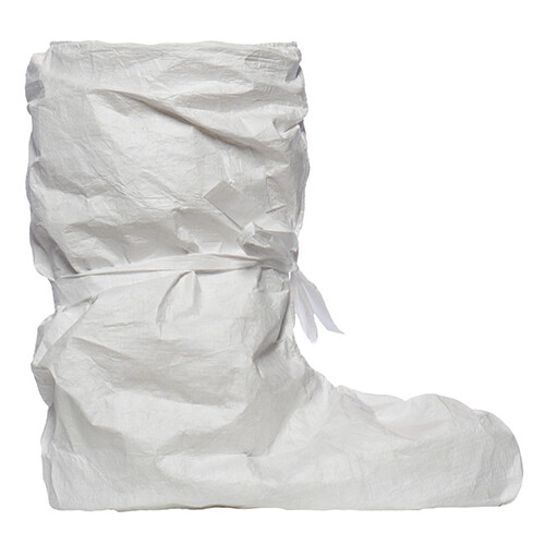 Materiale: Tyvek® 1431N (polyethylenfibre). Antiskrid-sål. Bredde: 42 cm. Højde: 48 cm. Slidstærkt, fnugfrit og antistatisk. Beskytter mod støv, væskestænk og visse kemikalier. Støvleovertræk har elastik ved kant og bindebånd. Indvendige syninger. Onesize.