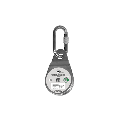 Wirehjul med karabinhage til DB-A2 treben. Dette wirehjul skal bruges når der sidder enten lastspil eller faldblok med redningshejs på benene. Wiren løber rundt om hjulet der bliver monteret i toppen af trebenet.