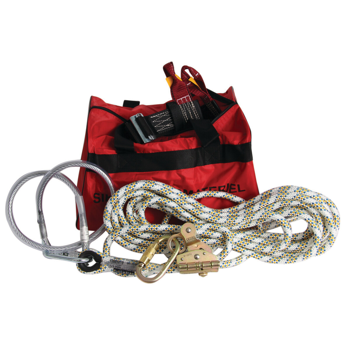 Taske m/reb 10 m 6803630, 2-P sele m/click 6801086, aftagelig glider til 14 mm reb 6803640, wirestrop 6803238 og karabinhage 6803035. Det er kun den medfølgende glider AC12, der er godkendt til reb 6803630