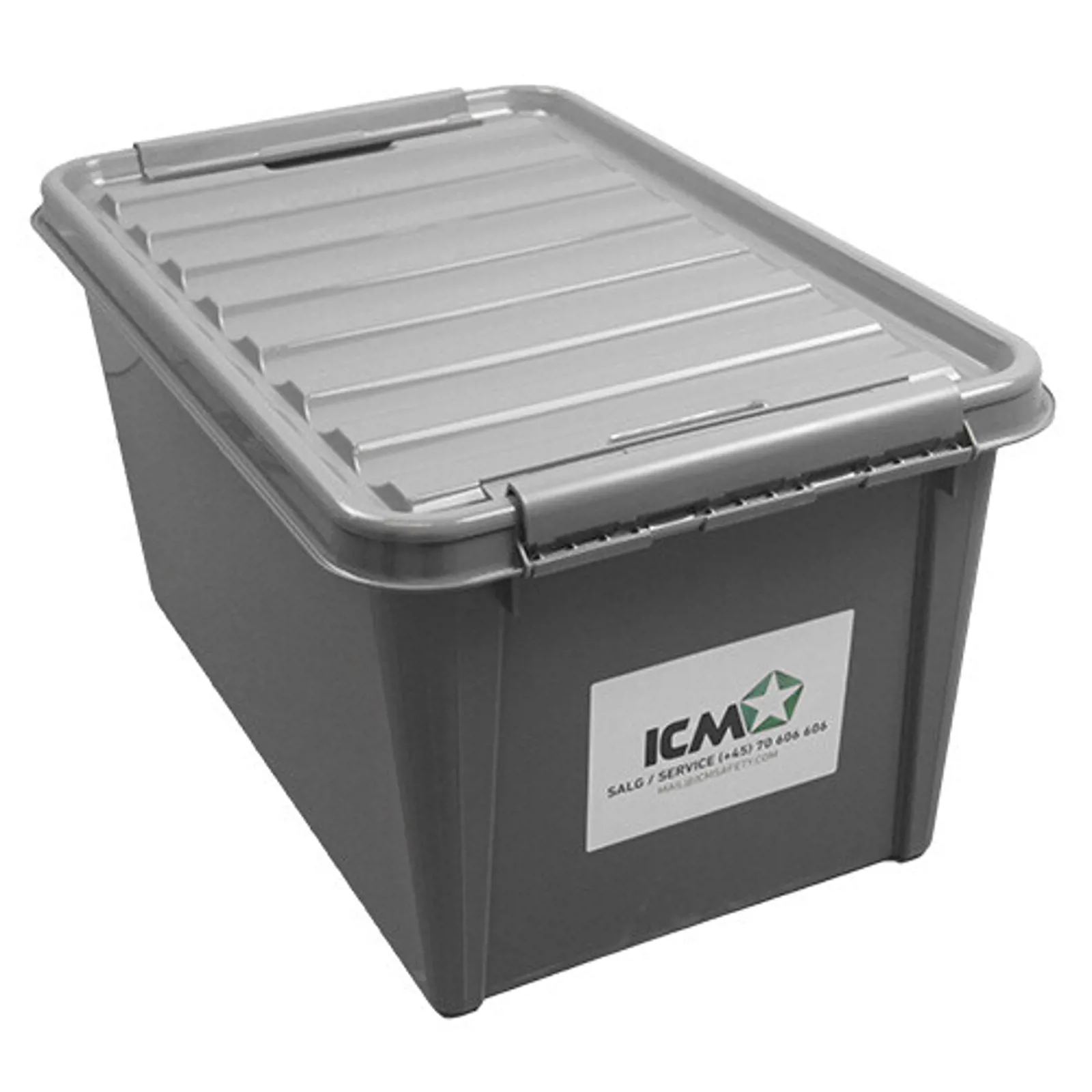 ICM opbevaringsbox i genanvendt PP med låg der klipses fast. Kapacitet: 45 liter. Mål: 59 x 39 x 31 cm.