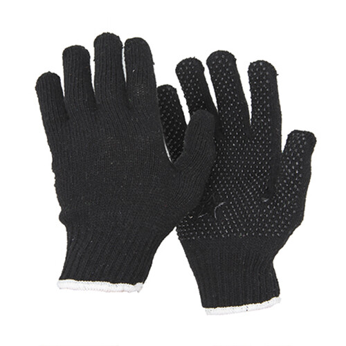Sort strikhandske af 70 % Polyester, 30 % Bomuld med rib og sorte PVC-dotter. God og tæt pasform, som giver god komfort. PVC-dotterne gør, at handsken har et godt greb – også ved glatte emner.