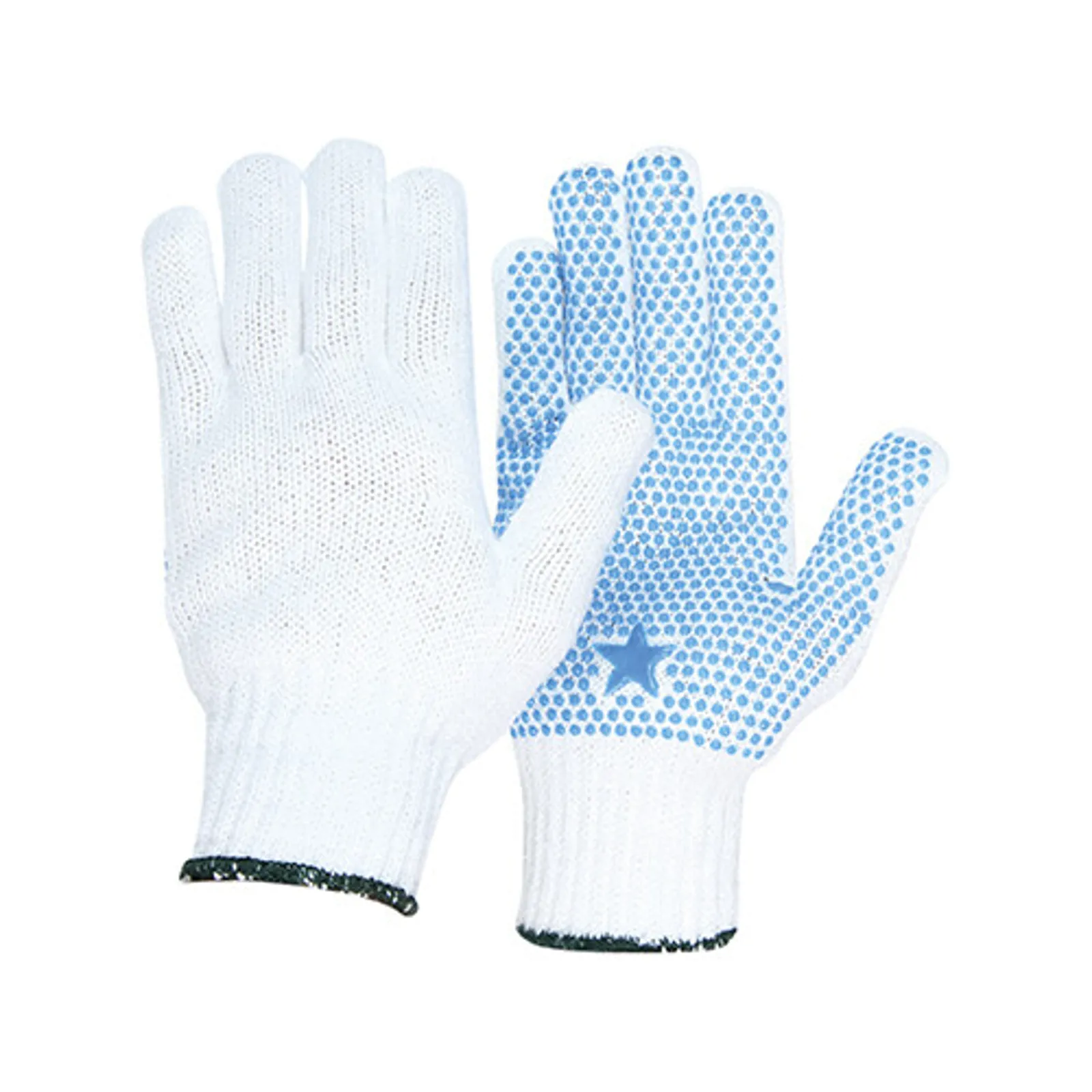 Strikhandske med rib (68 % Polyester, 15% Nylon, 17 % Bomuld) og PVC-dotter med god pasform. Faconstærk handske med bløde dotter, der giver godt greb om glatte emner.