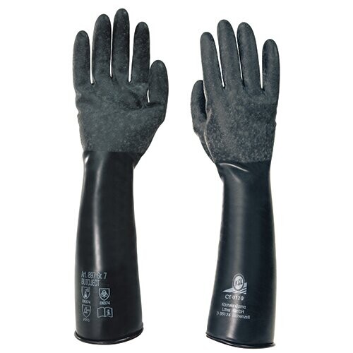 Fremstillet af butylgummi. Anatomisk pasform. Særligt egnet til arbejde med estere og ketoner. God fleksibilitet ved kulde såvel som den høje ozon- og UV-modstandsdygtighed gør det muligt at arbejde selv under ekstreme klimaforhold. Ru profilering i inderhånden sikrer godt greb. Længde: 36 cm. Tykkelse: 0,47 mm. AQL 0,65.