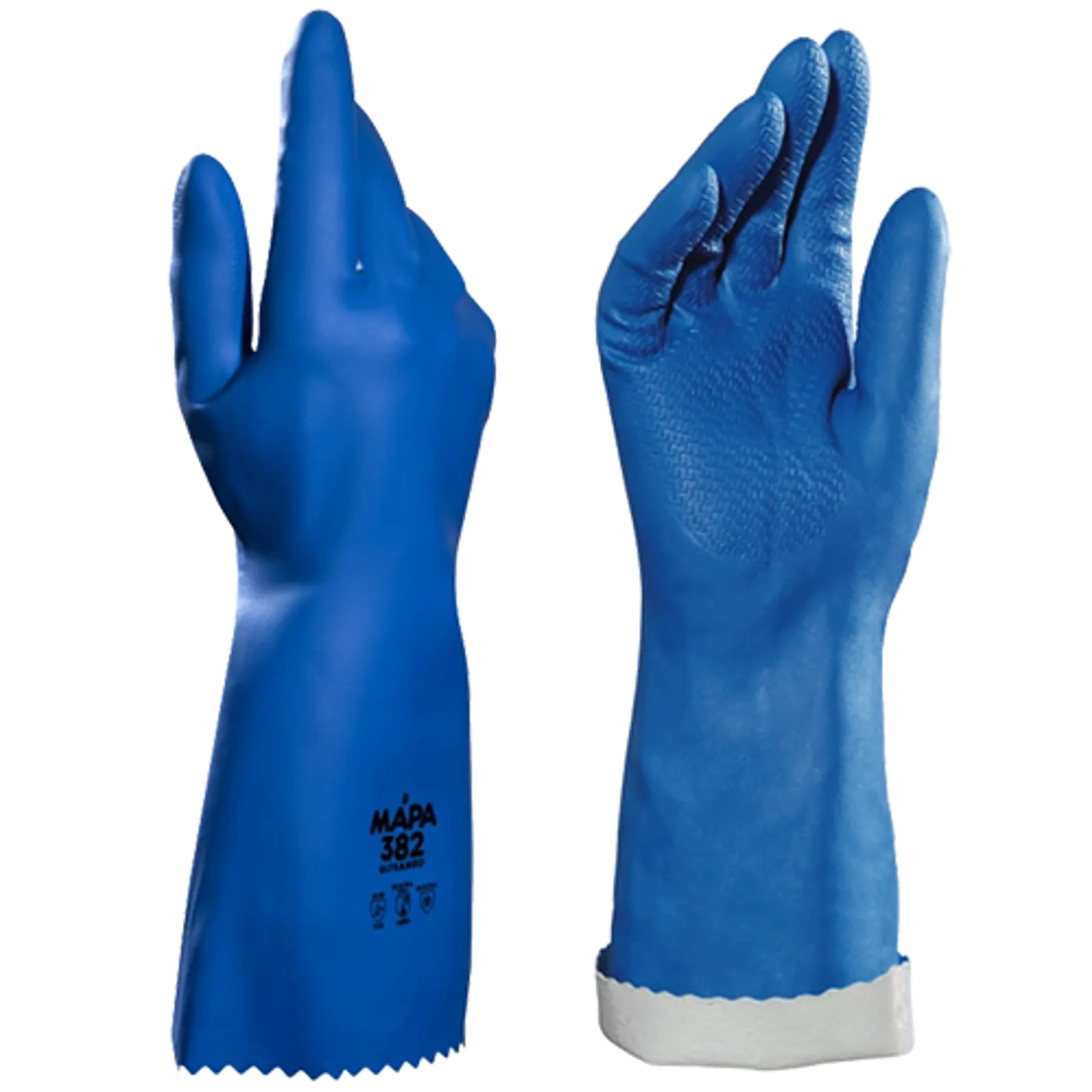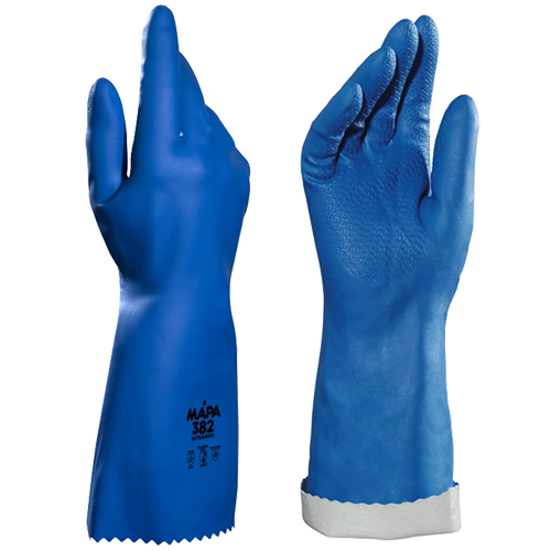 382 Ultraneo fra MAPA har maksimal komfort og kemisk beskyttelse. Handsken har øget komfort og termisk isolering på grund af bomuldsstrikket for og den er ekstremt smidig. Den har desuden præget tekstur for bedre greb på våde genstande. Silikonefri. Velegnet til mekanisk industri, kemisk industri m.fl. Handskerne er gode til blandt andet kemisk produktblanding, håndtering af tromler af kemiske produkter, manipulation af ventiler, laboratorieundersøgelser, maskinvedligeholdelse, overfladebehandling osv. Tykkelse: 0,95 mm. Længde: 36 cm.