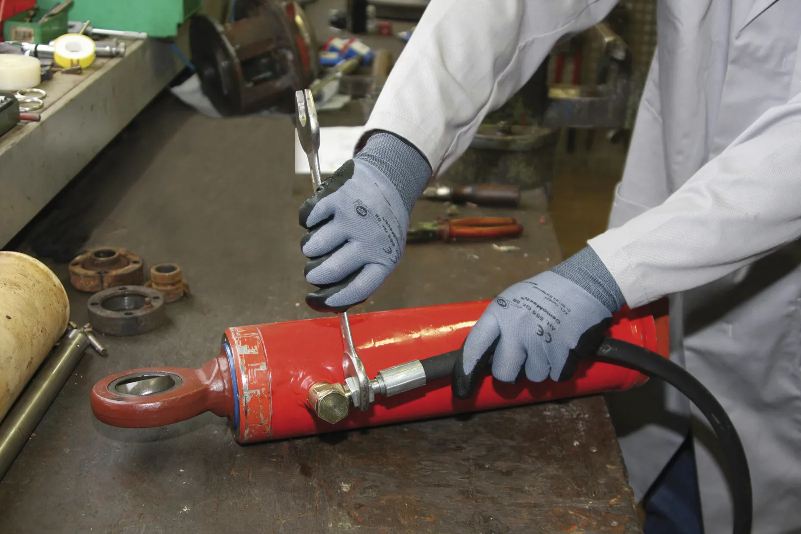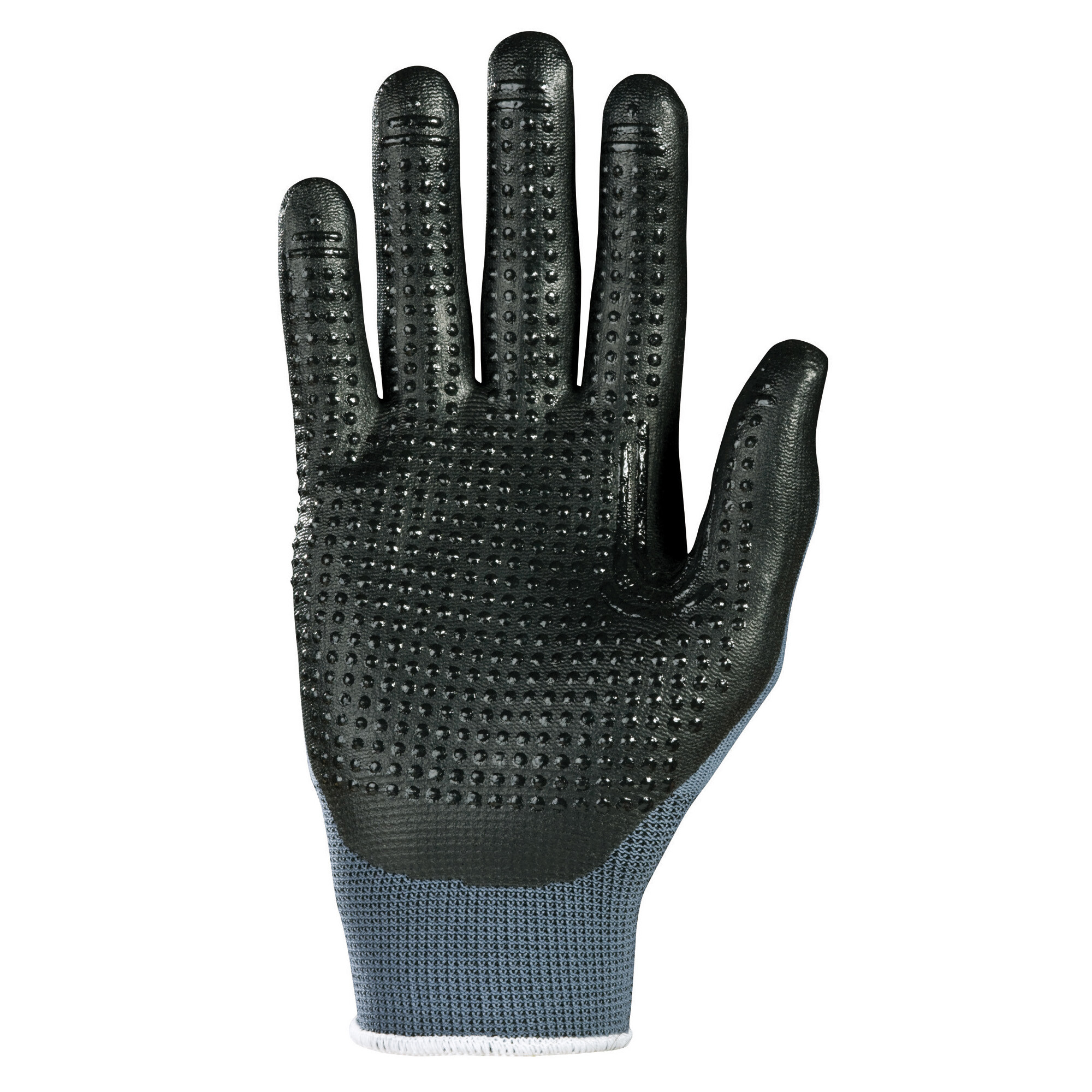 Sømløs polyamid handske. PU-dyppet med nitrildotter, som sikrer et godt greb selv på olierede og fedtede emner. Ideel til værksteder og mekanikere. Længde: 215–270 mm.