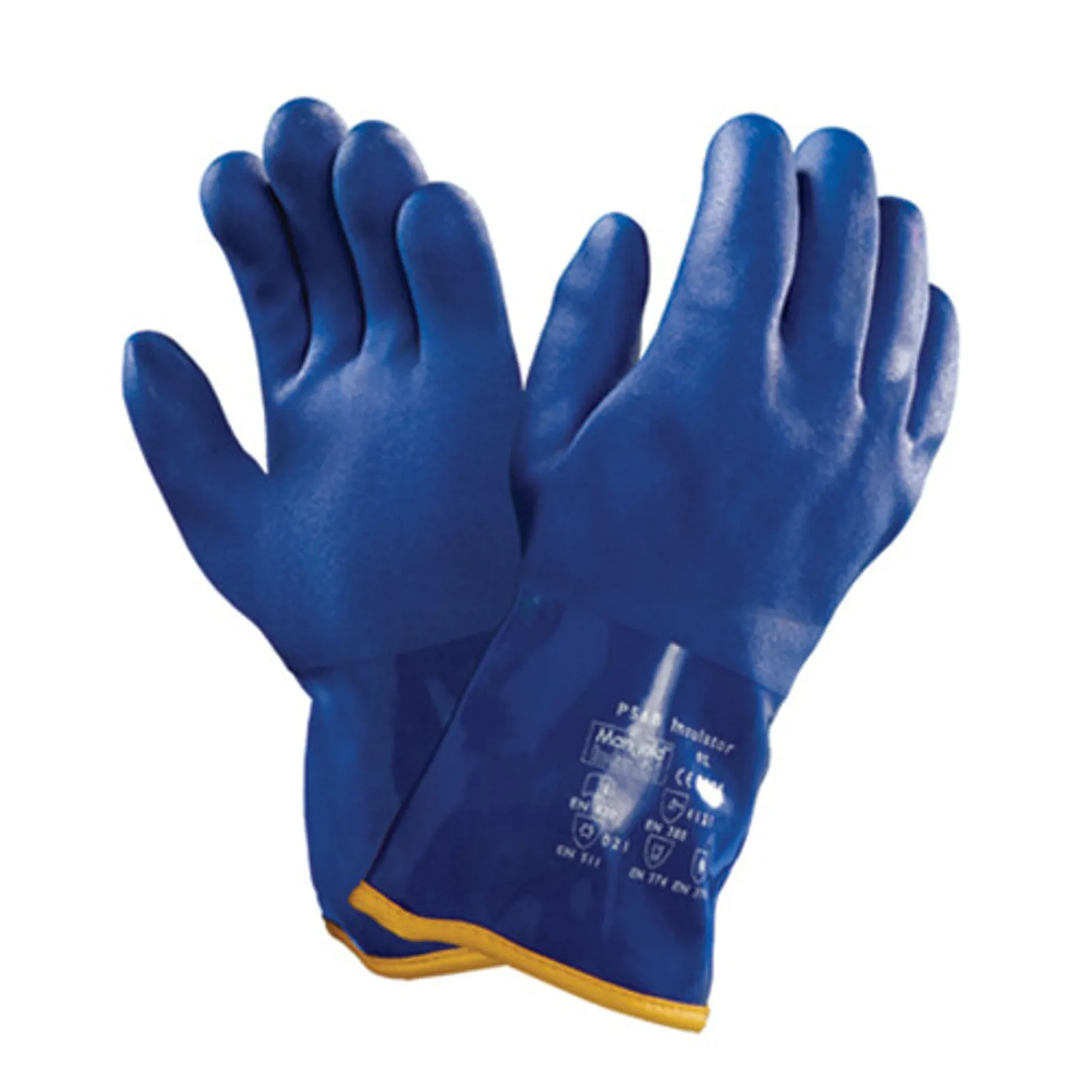 Indvendigt, sømløst akrylfor, trådtykkelse 13. Fuld, blød PVC-belægning med ru, sandblæst overflade på handsken og glat overflade på manchetten. Yder beskyttelse ved temperaturer helt ned til -30 °C. Godt greb, både ved håndtering af glatte og våde materialer. PVC-belægningen giver kemisk bestandighed. Egnet til udendørs brug inklusiv håndtering af kemikalier. Længde: 30 cm. AQL 1.5. Godkendt til håndtering af fødevarer.