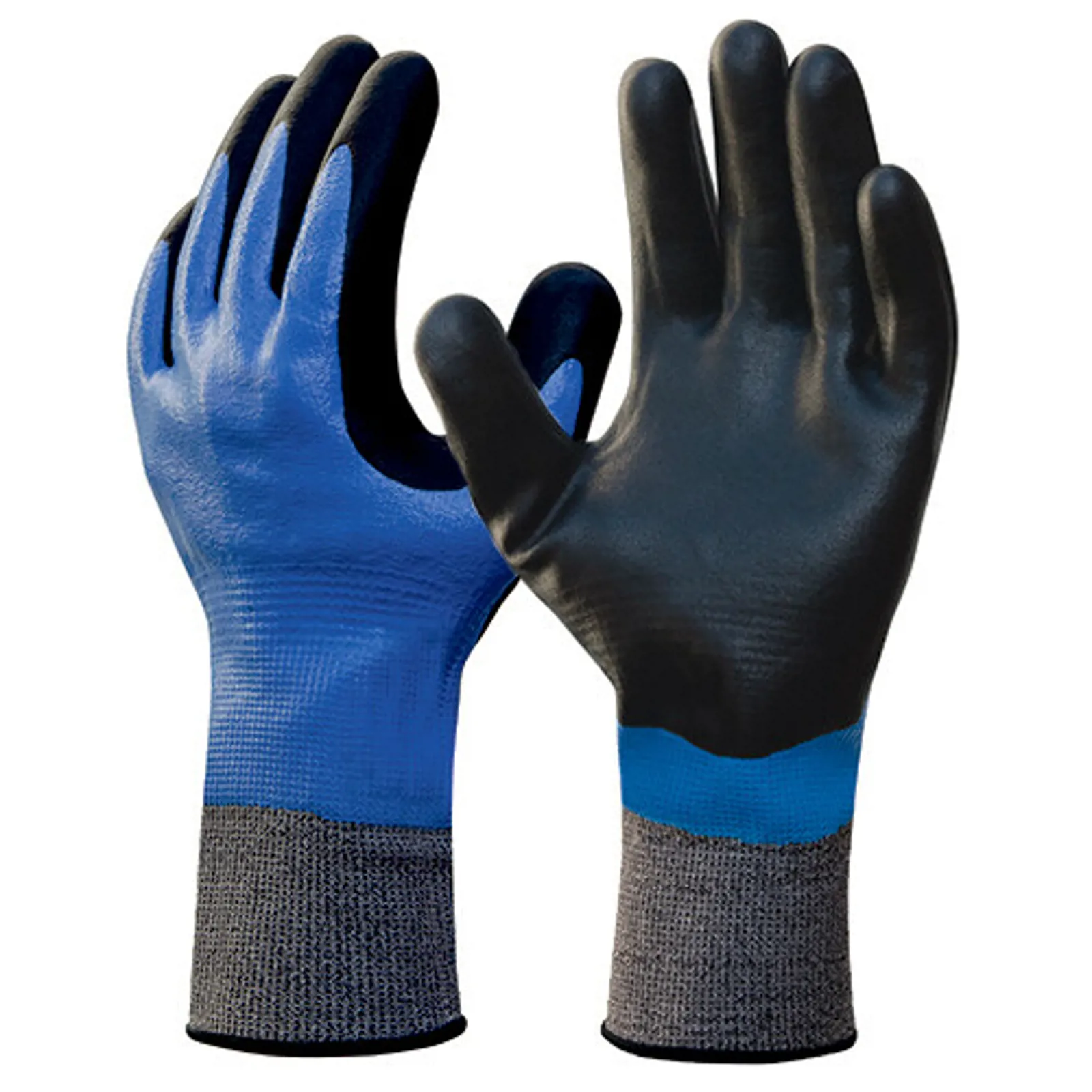Arbejdshandsker med patenteret Hagane Coil-teknologi, der giver høj grad af skærefasthed og samtidig god pasform. Dobbeltdyppet helt i nitril for at sikre beskyttelse mod olier, kulbrinter, fedt og slid. Nitrilskum-belægning i håndfladen. Godt greb - selv i olierede og våde omgivelser. Handskerne er desuden væskeafvisende i området med belægning. Strik uden syninger forhindrer irritation. Liner i rustfrit stål, polyester og nylon. Anbefalet til brug indenfor metallurgi, glas og glasur, byggeri, cement- og automobil-industrien.