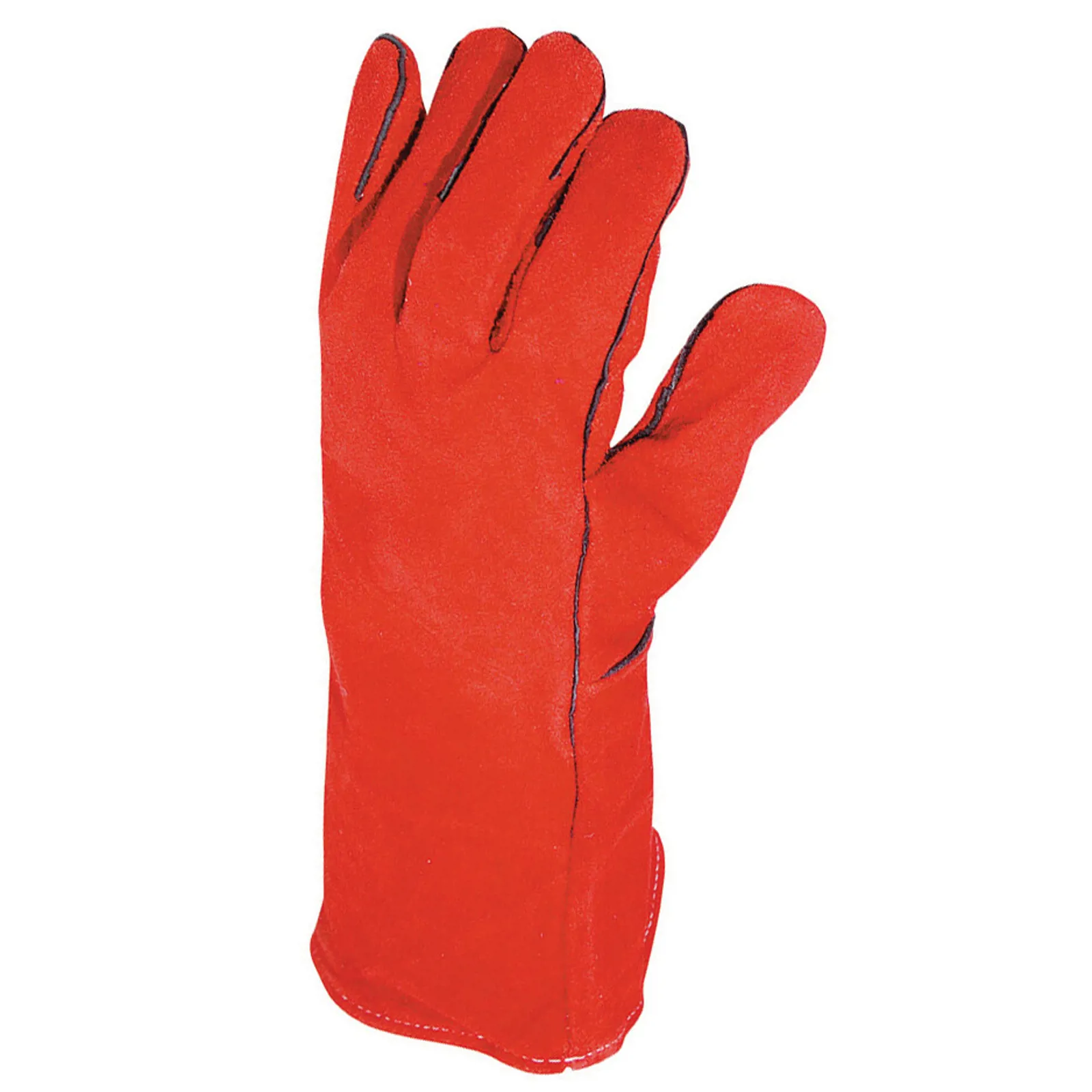Svejsehandske i rød 14" oksespalt med helfor af bomuld. 5-fingret model i god kvalitet. Oversiden er fremstillet i ét stykke skind. Længde: 35 cm.