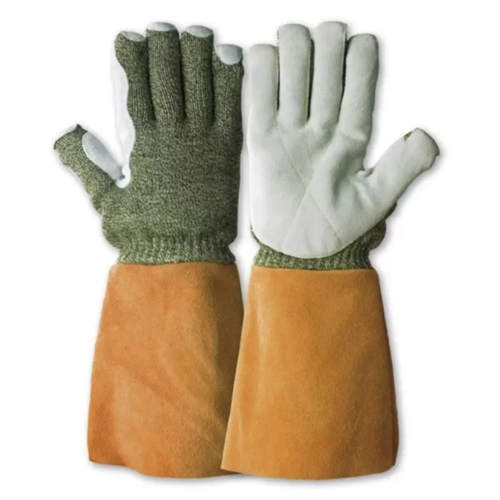 Femfingret varmebeskyttelseshandske af para-aramid og carbon. Lædermanchet, læder i håndfladen og inderhandske af bomuld. Lædermanchetten giver god beskyttelse af underarmen. Varmebestandig op til 350 °C. God skærefasthed, niveau 4. Længde: 39 cm.