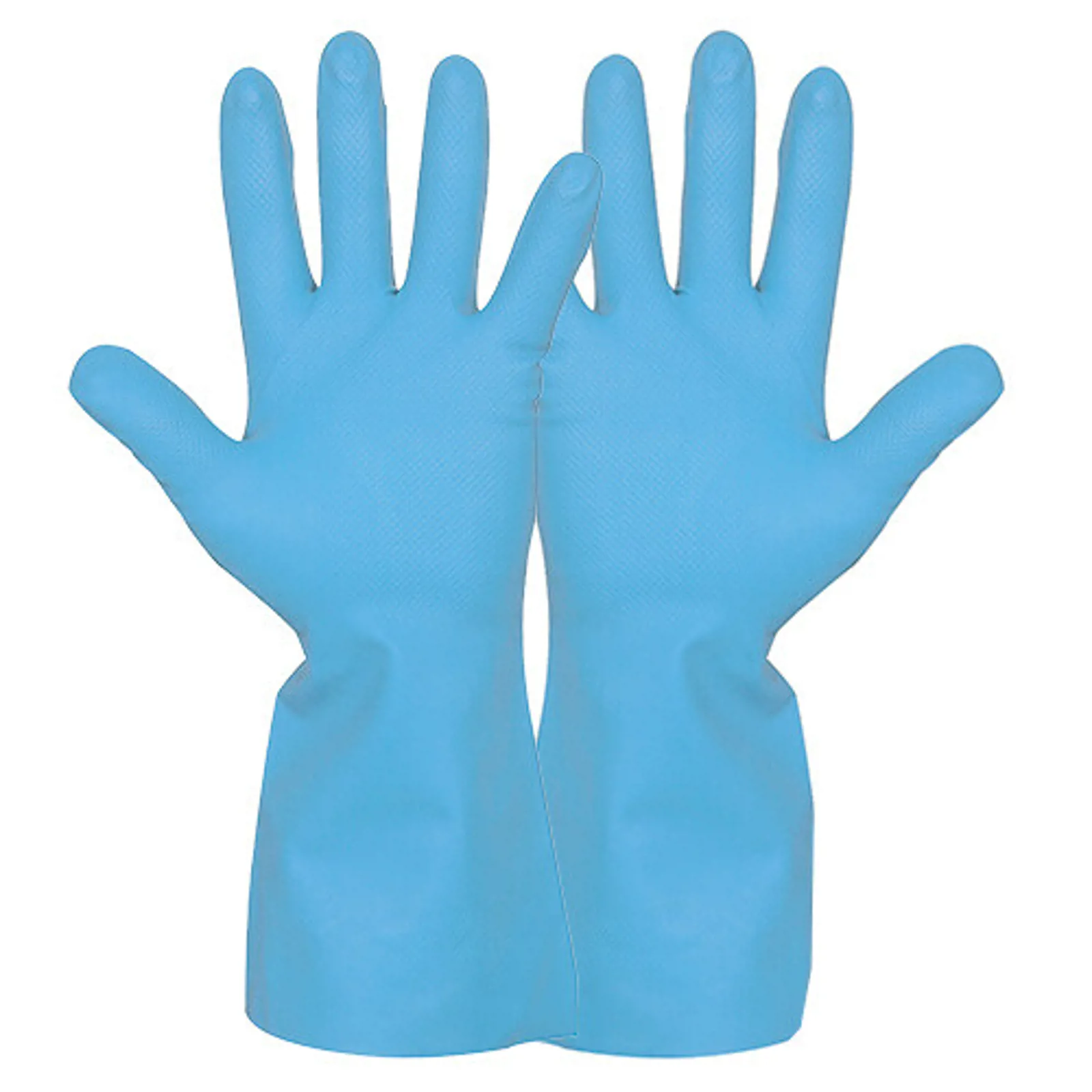Blå vinyl – god kvalitet, uden phtalater. Formstøbt med god pasform. Kraftig velourisering. Mønster i håndflade for bedre vådt/tørt greb. God resistens mod vandblandede kemikalier og rengøringsmidler. Indpakket enkeltvist, 10 par i boks. Længde: 31 cm. Tykkelse: 0,6 mm. AQL 1,5.