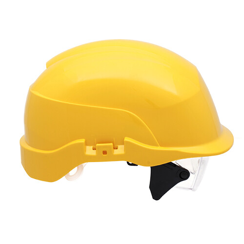 Sikkerhedshjelm i stærk ABS plast med indbygget sikkerhedsbrille. Brillen er 3-vejs justerbar og passer derfor udover de fleste styrkebriller. Hjelmen har Centurions AquaDirect system, som leder regnen væk og reducerer risikoen for at få regn ned af nakken. Hjelmen har også det største areal til logo print af alle sikkerhedshjelme på markedet, og arealet er også velegnet til ID kortholderen, som er ekstraudstyr. Fås både med og uden ventilation og med og uden håndhjul. Størrelse 51-63 cm. for standard indtræk og størrelse 52-64 cm. for håndhjulsindtræk. Vægt: 420 g.