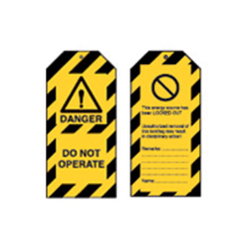 LOTO skilt i gul og sort med teksten "Danger do not operate". Mål: 160 x 75 mm. Pakke á 10 stk.
