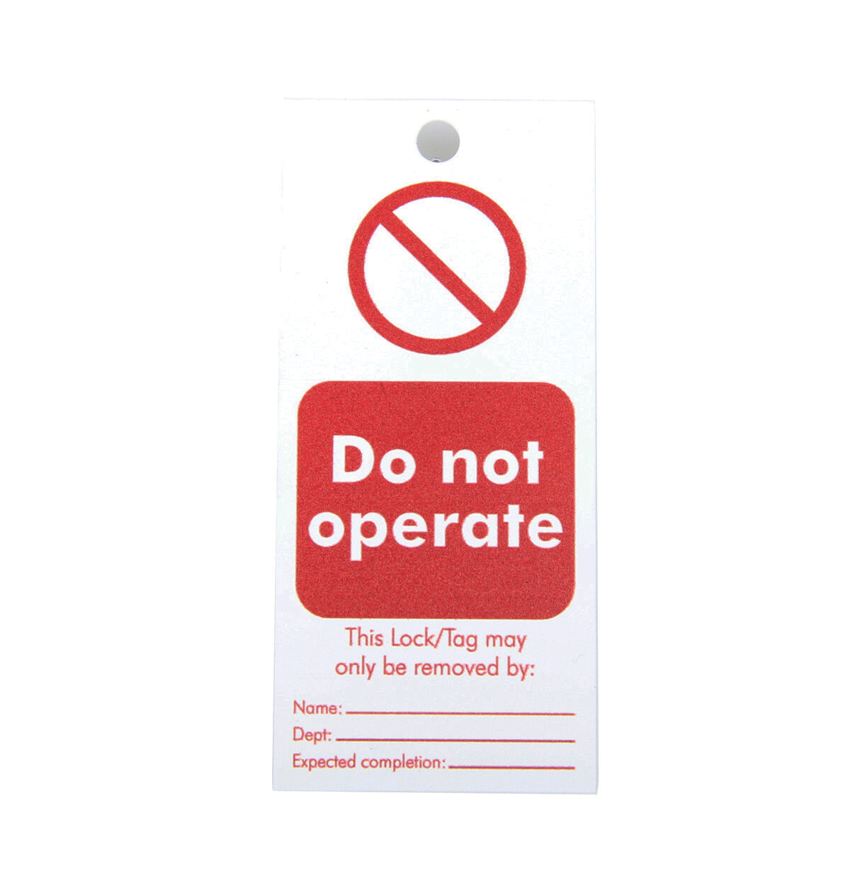 Brady skilt med engelsk tekst "Do not operate" til tagout med 10 strips. Mål: 110 x 50 mm.
